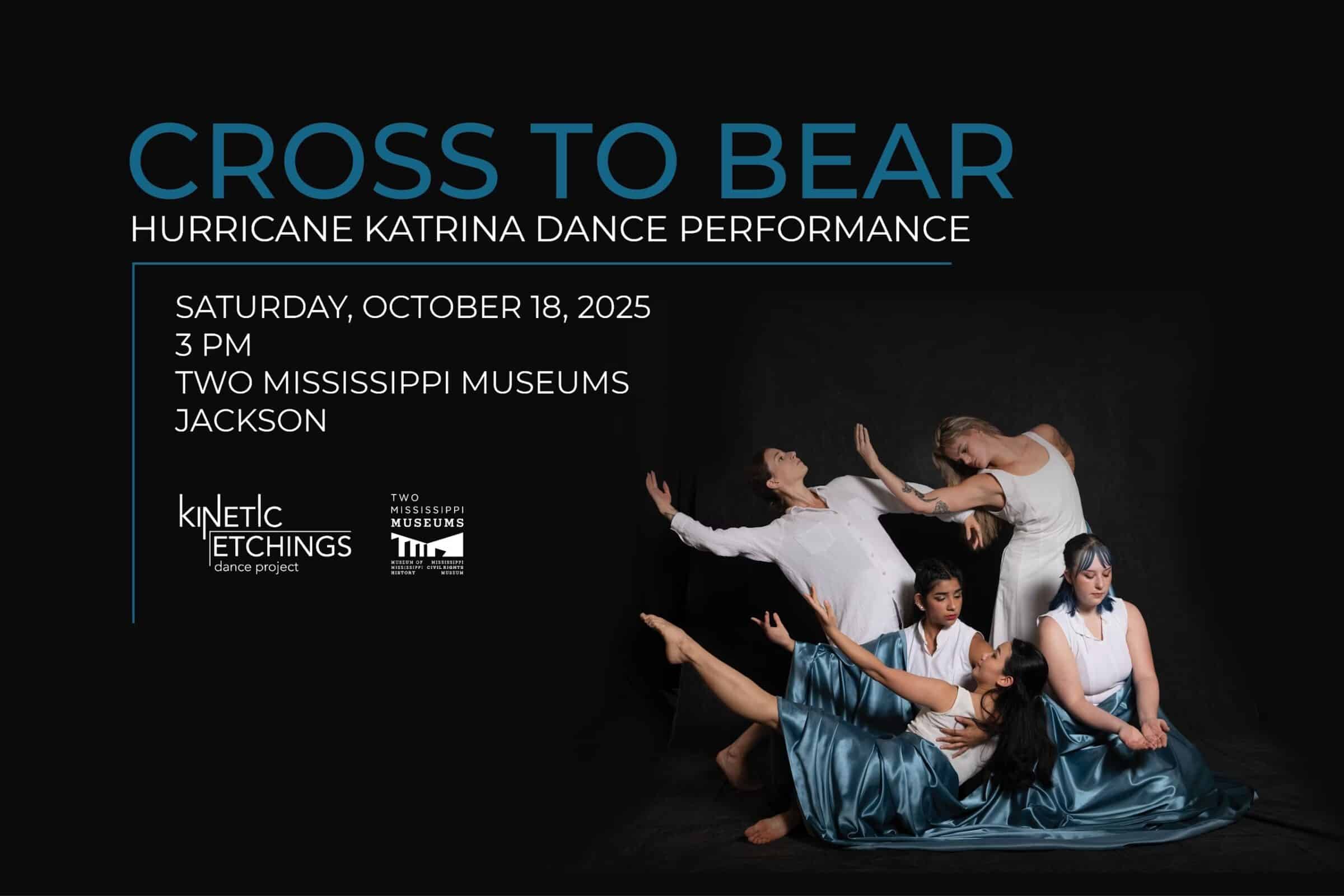 Come watch Kinetic Etchings lead a dance performance of Cross to Bear on Saturday, October 18, at 3 p.m. in the Craig H. Nielsen auditorium at the Two Mississippi Museums. Cross to Bear is inspired by the experiences of Louisiana and Mississippi residents during Hurricane Katrina and its aftermath. After the performance, choreographer Bethany Philipp will lead a discussion with the audience. For more information, call 601-576-6850 or email info@mdah.ms.gov.