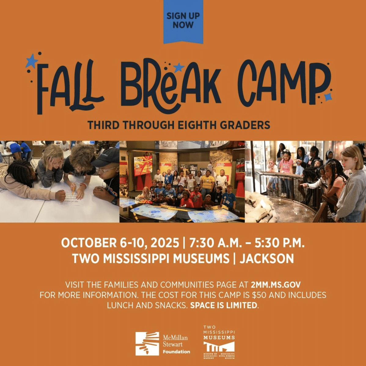 This session takes place on October 6-10 from 7:30 a.m. to 5:30 p.m. in the Pete Spiro Classroom at the Two Mississippi Museums. Registration is $50 a week for third through eighth grade students. Space is limited to thirty campers. Register here by September 22. For more information, contact Jasmine Holmes, MDAH education and outreach manager, at 601-576-6773 or at jholmes@mdah.ms.gov.